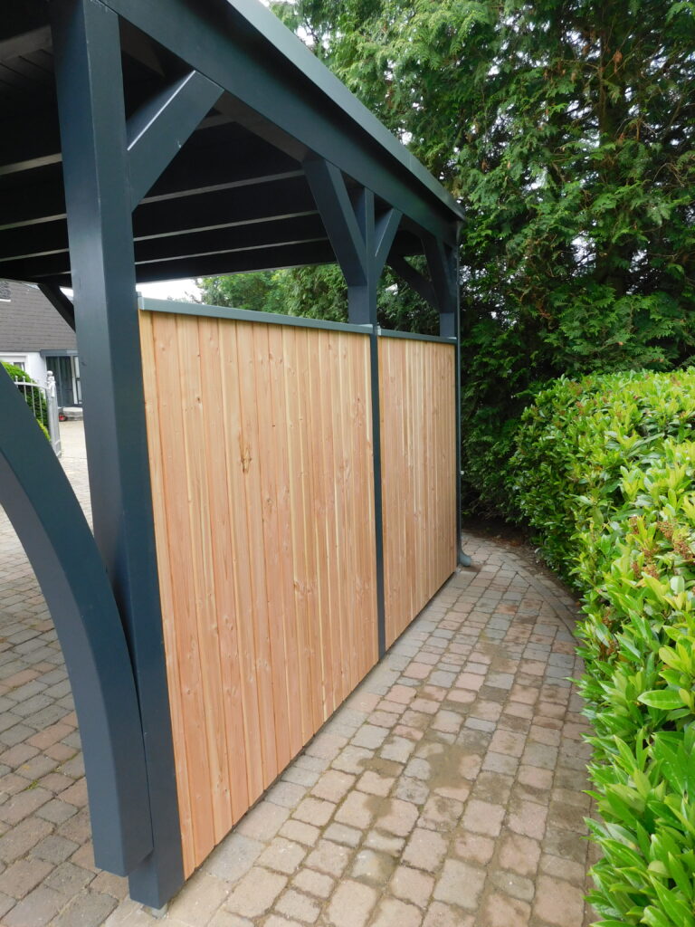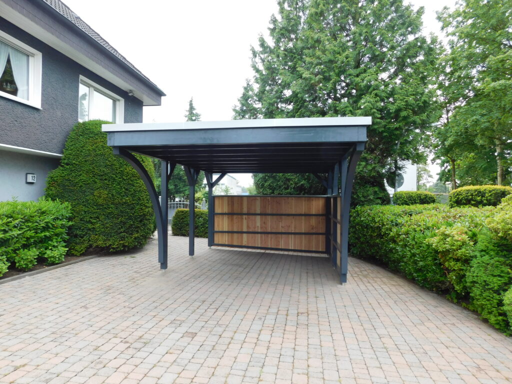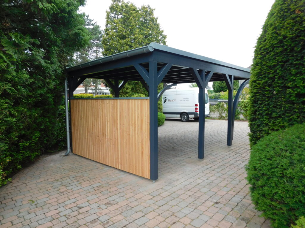 Besonders praktisch ist die seitliche Wandverkleidung. Sie schützt das Fahrzeug zusätzlich vor Wind und Regen und sorgt gleichzeitig für mehr Privatsphäre. Die Kombination aus dunkler Tragkonstruktion und heller Holzverschalung schafft einen ansprechenden Kontrast.